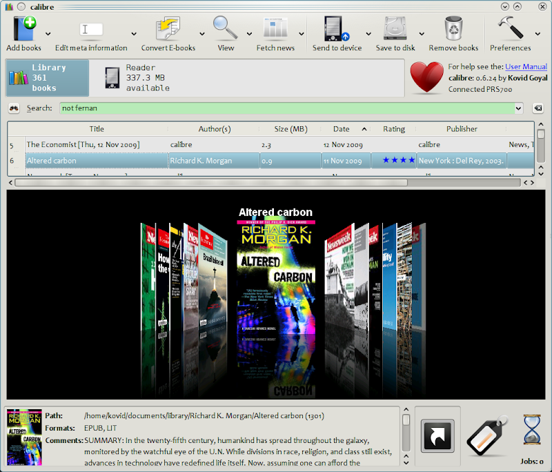 Avec Calibre vous pourrez gérer votre bibliothèque de livres électroniques et synchroniser vos fichiers avec votre liseuse (SONY PRS-505 ou autres, voir la liste des appareils supportés sur le site officiel ou l'article Calibre (logiciel) ).