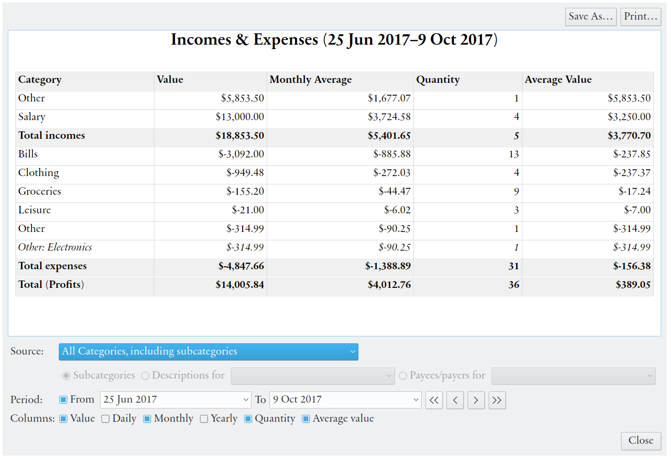 - Chaque liste de transactions affiche des statistiques descriptives de base et permet de filtrer les transactions en fonction de la date, de la valeur, de la catégorie/compte, de la description et du bénéficiaire.