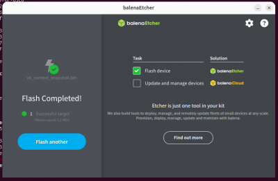 Cliquez ensuite sur "Flash!", puis introduisez votre mot de passe si il vous est demandé (sur Ubuntu) ou acceptez que l'application apporte des modifications à votre appareil (sur Windows ou macOS). L'image sera déployée sur votre support. La progression de l'opération est affichée.