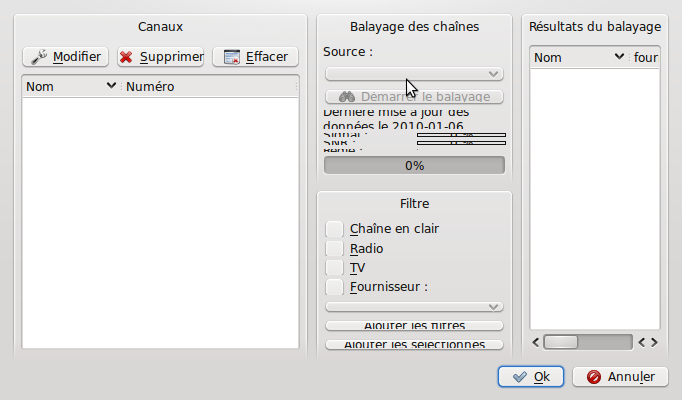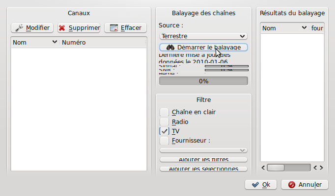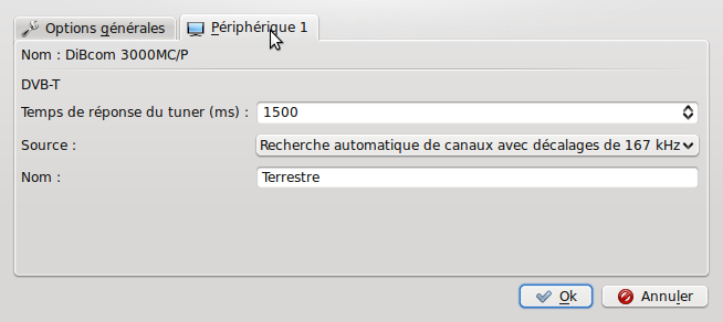 Au premier démarrage Kaffeine ne la détecte pas comme source pour scanner les canaux : ce dernier est grisé (voir image).