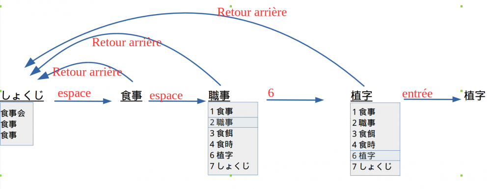 Notez que tant que vous n'avez pas fixé définitivement le choix du candidat avec la touche Entrée, vous pouvez toujours revenir au mot en hiragana avec la touche Backspace