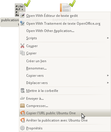 - Ils seront accessibles à toute personne possedant l'adresse du fichier, même si cette personne n'utilise pas Ubuntu One. - Pour publier un fichier, il faut qu'il soit dans un dossier synchronisé avec Ubuntu One (voir ci-dessus), puis faites un clic droit et sélectionnez : Publier sur Ubuntu one :